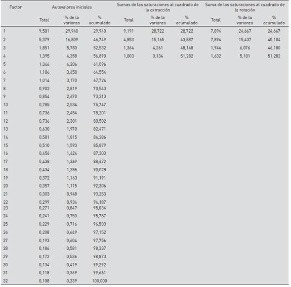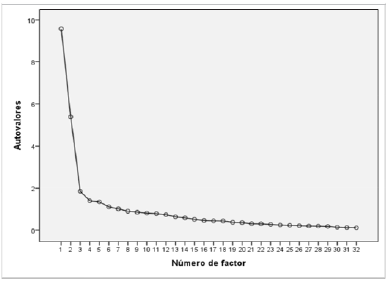 Dada la ausencia en la literatura de una escala de medida en competencias, formación y participación en actividades de RS en el contexto universitario, se optó por la creación de una propia, a partir de un conjunto de 32 ítems apoyados en literatura de referencia tal y como se ha indicado. No obstante, para la posterior utilización de esta escala, es necesario validar los indicadores, para lo cual se va a someter la escala, en primer lugar, a un análisis factorial exploratorio (AFE). Mediante esta técnica se agrupan las variables (ítems) que se correlacionan fuertemente entre sí, y cuyas correlaciones con las variables de otros agrupamientos (factores) son menores (Pérez y Medrano, 2010). Es decir, se lleva a cabo la agrupación del conjunto de variables observables en función de la variabilidad que cada una de ellas comparte con las demás. Lo anterior determina la utilidad de esta técnica para detectar fuentes latentes de covariación entre medidas observadas.