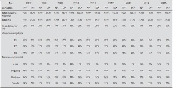 Tabla 1 Industria manufacturera y sector IAB colombiano según ubicación geográfica y tamaño (2007-2015).