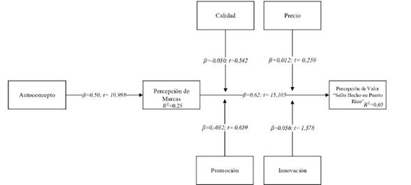 En esta parte se analiza si el factor calidad (H3 ϐ =-0,030, p<0,01, t=0,542, t > 1,28), precio (H4 ϐ =0,012, p<0,01, t= 0,259, t > 1,28), innovación (H5 ϐ =0,056, p<0,01, t= 1,578, t > 1,28) y promoción (H6 ϐ=0,-032, p<0,01, t= 0,659, t > 1,28) moderan el impacto que genera la percepción sobre el efecto de autocongruencia y el valor percibido de marcas que contengan el sello “Hecho en Puerto Rico”. Los resultados antes descritos llevan a un rechazo a las hipótesis H3 (calidad), H4 (precio) y H6 (promoción). Los resultados reflejan que las variables calidad, precio y promoción no moderan la percepción de marcas y el valor percibido de las marcas que tienen el sello “Hecho en Puerto Rico”; no obstante, la hipótesis H5 (innovación) es aceptada.