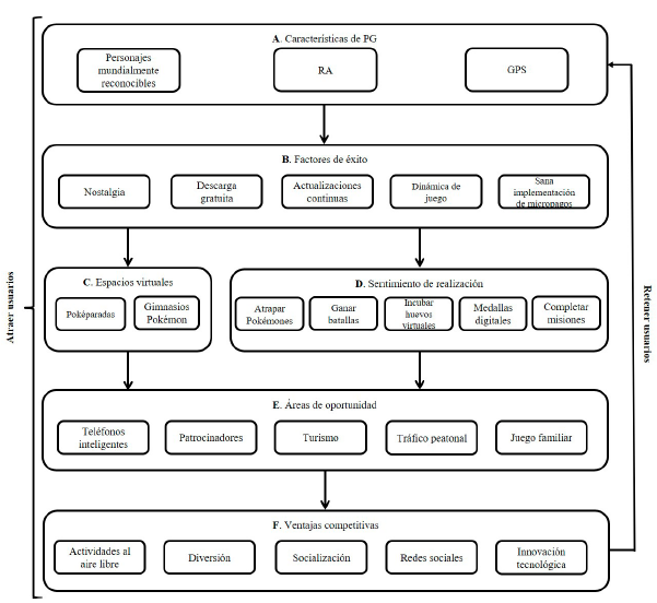 A partir de los factores de éxito identificados en la sección anterior, se propone un modelo teórico que dé cumplimiento al objetivo de la investigación. El modelo elaborado consta de seis apartados y se visualiza con detalle en la Figura 2. Dicho modelo, se sostiene en la tarea primordial de atraer y retener a los usuarios de PG para el éxito empresarial, por ello, inicia con los elementos diferenciadores que vuelen especial a PG, luego se describe la relación entre los factores de éxito, los espacios virtuales, y el sentimiento de realización percibido por los jugadores. Prosigue, con las áreas de oportunidad detectadas de PG y finaliza con las ventajas competitivas de alto impacto para hacer frente a los desafíos cotidianos de un mundo cada vez más globalizado. Los citados apartados se explican a continuación: