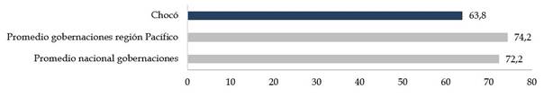 Además de la MDM, para evaluar la gestión pública territorial se considera también el Índice de Procuraduría General de la Nación Gobierno Abierto (IGA) calculado por la Procuraduría General de la Nación. Este último es un indicador del grado de reporte de información y del avance en la implementación de normas que promuevan el fortalecimiento de la gestión pública en el territorio. Como se observa en la figura 12, Chocó enfrenta un rezago en este tema. Con un IGA de 63,8, el departamento se ubica por debajo de las gobernaciones en la región y el país.