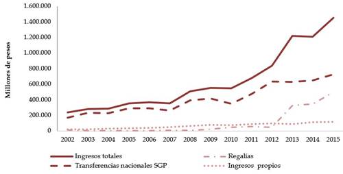 En relación con su participación en el total, el primer lugar lo ocupan las transferencias del SGP, las cuales representaron 50% de los ingresos totales en 2015. A esta cuenta le siguieron en orden de importancia las regalías (34,4%) y los ingresos tributarios y no tributarios o ingresos propios (7,9%). Estos últimos con un bajo dinamismo durante todo el periodo analizado.