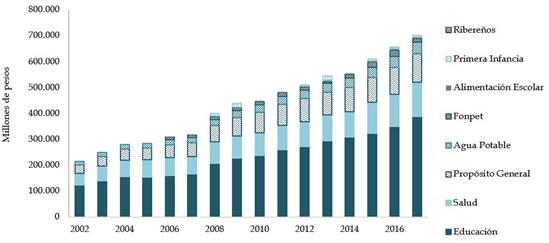 En Colombia, las transferencias del nivel nacional provienen del SGP, una única bolsa que agrupa los recursos que el Gobierno nacional central transfiere a las entidades territoriales, destinados a salud, educación, agua potable y saneamiento básico y para propósito general. En Chocó, como se observa en la figura 9, los recursos por SGP pasaron de 219.109 millones de pesos en 2002 a 711.437 millones de pesos en 2017. En este último año, la participación por sectores en orden de importancia fue educación (54,6%), salud (18,5%), propósito general (15,5%), agua potable (6,2%), Fondo Nacional de Pensiones de las Entidades Territoriales (Fonpet) (2,2%), resguardos indígenas (1,3%), alimentación escolar (0,9%) y primera infancia (0,8%).