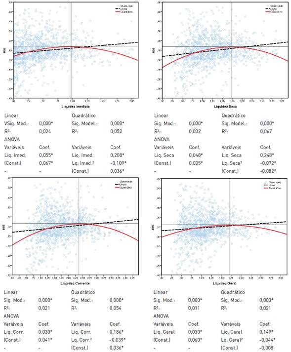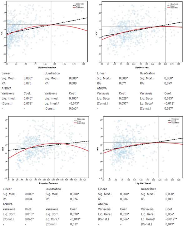 Todavia, regressões quadráticas apontam, com poder explicativo superior, que de fato a relação entre folga financeira e desempenho econômico não é linear, corroborando com entendimentos recentes de autores como Stan et al. (2014), Laffranchini e Braun (2014), Guo et al. (2018) e Geiger et al. (2019). Logo, tem-se a confirmação empírica dos pressupostos de Tan (2003) de que deve haver um limite para o nível de folga financeira que uma organização necessita de reserva.