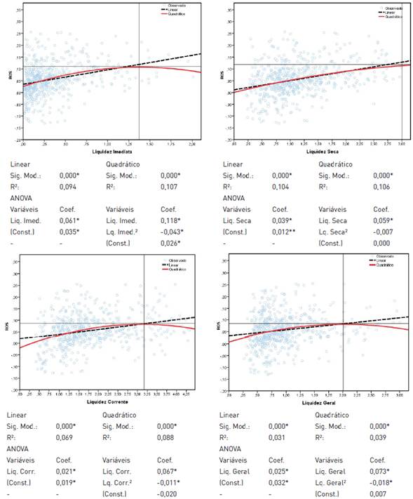 De acordo com as Figuras 3 e 4, percebe-se que apenas um dos modelos de regressões quadráticas não foi significativo ao nível de 5% (entre ROE e liquidez geral para empresas industriais mexicanas), demonstrando, dessa forma, a supremacia da relação não linear nos ambientes estudados. Na sequência, tem-se, conforme constructo de variáveis, a influência da folga financeira no ROS de empresas industriais brasileiras.
