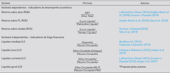 *Proposta pelos autores: esta variável é proposta no cerne da metodologia adotada nesta pesquisa. Sua fórmula é amplamente utilizada em estudos de finanças corporativas com outros arranjos. Ressalta-se ainda que medidas de folga que consideram aspectos de longo prazo são utilizadas adicionalmente em outras pesquisas, como de Geiger et al. (2019), mas não sob esta configuração específica.
