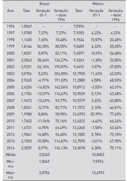 Mediante os dados da Tabela 3, é possível observar que, no geral, a moeda brasileira depreciou em maior magnitude comparativamente à moeda mexicana perante o dólar, no período em estudo. Especificamente, a cotação média do dólar frente ao real em 1996 era de 1,0049 e, em 2014, de 2,3529 (valorização de 134,13%). Para o contexto do México, percebe-se que apesar do peso mexicano também ter depreciado ao longo do período estudado, houve menor desvalorização. O dólar estava cotado em 1996 a 7,5996 pesos mexicanos e, em 2014, a cotação era de 13,3078 (acréscimo de 75,11%).