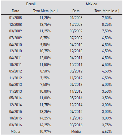 Tabela 5 Taxa de juros Brasileira e Mexicana conforme BACEN e BANXICO nos anos de 2008 a início de 2016