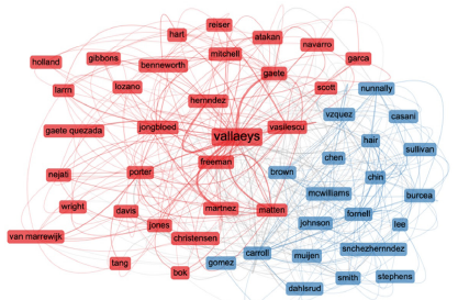 Respecto a la red de cocitaciones (figura 5), se observa que el autor principal es François Vallaeys, quien es el más citado dentro de la red y con el mayor número de conexiones. Además, se pueden evidenciar dos clústeres de autores, el primero y más grande integrado por algunos investigados como: Vallaeys, Gaete-Quezada, Vasilescu, Martínez, Christensen, Hernández, Matten, Benneworth y Mitchell; el segundo compuesto entre otros por: Brown, Gómez, McWilliams, Hair, Vázquez, Johnson y Fornell.
