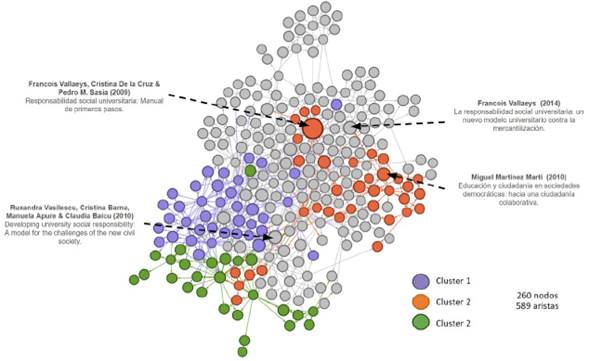 La figura 7 muestra la red de la RSU (compuesta por 260 documentos) a la cual se aplicó el algoritmo de modularidad de clase, el cual permite visualizar dentro de la red diferentes comunidades (clúster) integradas por nodos densamente conectados (Blondel, Guillaume, Lambiotte y Lefebvre, 2008), en este caso se identificaron tres perspectivas. Los nodos de mayor tamaño son los documentos que se han citado con mayor frecuencia dentro de la red, esto implica que son considerados los más relevantes en este campo del conocimiento. En este caso se señalaron los 4 más importantes.