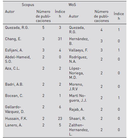 En relación con los autores, la tabla 3 proporciona el listado de los autores más relevantes, clasificándolos por el número de documentos publicados en cada base de datos, además, se relaciona su índice h (H-index), este indicador es empleado para caracterizar la producción científica de cada investigador (Hirsch, 2005). Ricardo Gaete Quezada lidera la producción tanto en Scopus como en WoS, con un total de 9 artículos publicados en ambas bases de datos, sin embargo, el H-index de este autor no es el mejor dentro de este listado; particularmente, Elizateth Chang y Farookh Hussain, quienes son coautores, cuentan con un indicador mucho más alto (tabla 3).