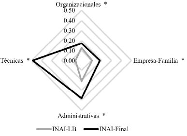 Antes de que las EFAA participaran en la capacitación, realizaban algunas actividades que fueron promovidas como innovación durante la intervención, lo que dio como resultado un INAI-LB promedio de 0,14; posteriormente, con la apropiación y fortalecimiento del conocimiento, se alcanzó un INAI-Final promedio de 0,31; de manera global y en las cuatro categorías de innovación se encontraron cambios positivos y significativos (p<0,01) en la LB y Final como se observa en la figura 1.