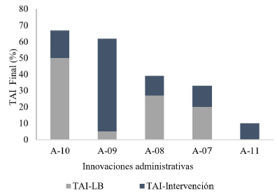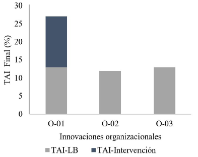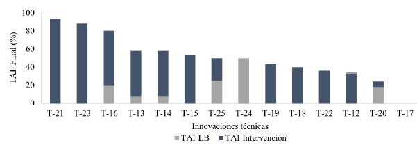 Ambos indicadores (INAI-TAI) se calcularon para las prácticas que se implementaban antes de la capacitación, consideradas como línea base (LB), y para las innovaciones que se implementaron posterior a ella, al sumar ambos índices, se obtuvieron los indicadores finales. Para determinar si existían cambios significativos como resultado de la capacitación, se realizó una comparación de medias utilizando la prueba estadística t para muestras relacionadas en el INAI-LB y final por categoría de innovación.