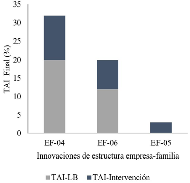 En las innovaciones técnicas, con la capacitación se logró aumentar el INAI de 0,06 obtenido en LB a un INAI-Final de 0,49. Las innovaciones administrativas tenían el mayor INAI promedio de LB (0,21), en comparación con las otras categorías; con la capacitación se logró un aumento de 0,17, alcanzando un INAI-Final de 0,38. Para las innovaciones de estructura empresa-familia, el INAI-LB fue de 0,11 y, finalmente, se llegó a un INAI de 0,18. Las innovaciones organizacionales tenían un INAI-LB de 0,13, posterior a la capacitación se obtuvo un INAI-Final de 0,17. Las innovaciones técnicas fueron las que más se adoptaron, seguidas de las administrativas, en contraste con las de organización y las de empresa-familia, que fueron las menos aceptadas. La mayor adopción de técnicas de producción se debe, en parte, a que los representantes de las EFAA consideran que son solo productores agropecuarios y no empresarios, por lo que se inclinaron por prácticas para incrementar la producción, dejando de lado la realización de prácticas administrativas y organizacionales que requieren de conocimiento empresarial para su gestión. Lo encontrado en esta investigación coincide con estudios realizados en micro, pequeñas y medianas empresas (Mipyme) dedicadas al sector industrial de Colombia, en donde las innovaciones de procesos y productos tienen una mayor aceptación por parte de las empresas con efectos significativos en el rendimiento (Gálvez-Albarracín y García-Pérez de Lema, 2012).