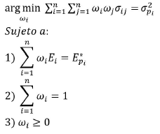El conjunto de portafolios eficientes tiene una representación geométrica bidimensional1 conocida como frontera eficiente, que relaciona todos los portafolios con la mínima varianza para los diferentes niveles de rendimiento esperado E*pi. La determinación de este conjunto se logra por medio de la resolución de un problema de optimización cuadrático-paramétrico con restricciones lineales, que se expresa como sigue: