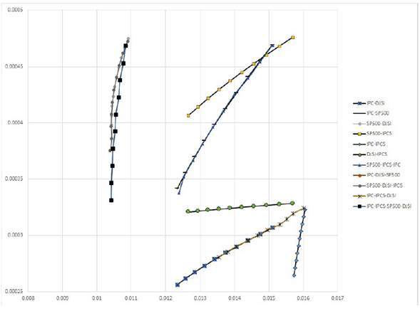 Como se puede apreciar, las combinaciones S&P 500-IPCS-DJSI y S&P 500-IPC-DJSI llevan los primeros dos lugares de eficiencia media-varianza (medida con el índice de Sharpe del portafolio tangencial de dicha combinación de índices). En tercer lugar, se aprecia el desempeño del portafolio que incluye los cuatro índices de interés. Esto es así por los índices de Sharpe de 3,9345; 3,9134 y 3,9131. Tales magnitudes permiten apreciar que invertir, de manera diversificada, en acciones ISR con un componente, factor o índice de mercado en el portafolio, mejora los resultados de desempeño, en comparación con lo que se lograría si se invirtiera de manera exclusiva en acciones mexicanas o estadounidenses de estilo ISR o de mercado.
