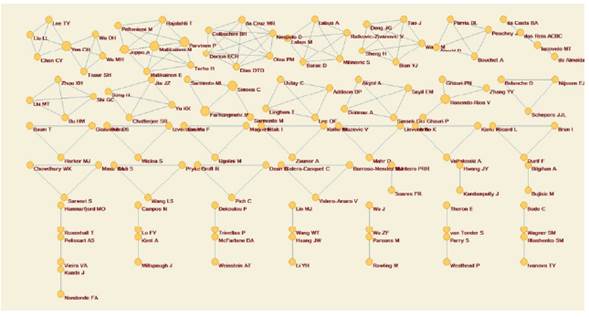 Al considerar la RSL de 2014 a 2018, se encontraron 50 artículos relacionados con la innovación dentro del paradigma del MR y se observó que, en cuanto a los autores, hay una gran dispersión de acuerdo con el análisis de red. Los resultados presentan una moda de “1” y un rango máximo de “2”; por lo tanto, se puede afirmar que no existe una autoridad que sobresalga dentro de la RSL en el tema de MR y la innovación. El análisis de coautores presenta diversos clústeres de aplicación que hacen que la red sea muy heterogénea; en ella se aprecia una gran cantidad de autores que abordan el tema de la innovación en el paradigma del MR, pero no se observa una tendencia a la concurrencia que permita identificar una escuela de pensamiento (figura 1).