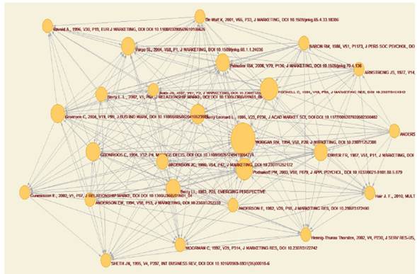 El análisis de citas permite entender sobre qué bases teóricas se construye la revisión de la literatura, de tal forma que se puedan concluir las estructuras de pensamiento desarrolladas en los artículos, en lo conceptual y metodológico. En este sentido, en el grafo de coocurrencia y frecuencias (mínimo 4) se destaca el artículo de Morgan y Hunt (1994), en el que se referencia el modelo de intercambio en el MR y en el que se toman las relaciones desde un concepto más holístico, es decir, más allá de lo solamente transaccional, donde la empresa interactúa con diferentes stakeholders con los que se debe construir compromiso por medio de la confianza. Otros referentes bibliográficos relevantes encontrados son Dwyer, Schurr y Oh (1987); Berry (1983); Grönroos (1994, 2004); Sheth y Parvatlyar (1995); Gummesson (2002); Anderson y Weitz (1992); Anderson, Håkansson y Johanson (1994); Anderson y Narus (1990), los cuales desarrollan el paradigma del MR desde tres diferentes escuelas de pensamiento en marketing: la nórdica, la anglo-australiana y la norteamericana. Estos artículos muestran posturas teóricas y hallazgos empíricos sobre la relación comercial tanto con proveedores como con consumidores, lo que demuestra cómo el compromiso y la confianza impactan en la satisfacción y lealtad, siempre en busca del beneficio mutuo entre ellos y la adopción de cambios significativos en sus procesos, productos y formas de ofertar o recibir servicios.