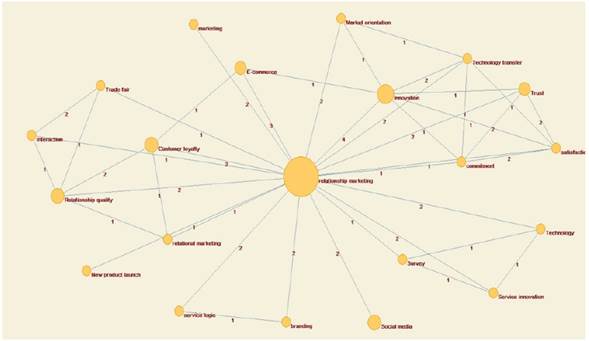 Sobre las palabras clave, con base en la red de coocurrencias, se puede concluir que el término marketing relacional es el que posee la mayor frecuencia (se encuentra en el 52% de los artículos) y cuenta con la mayor cantidad de relaciones, muchas de ellas son palabras o términos que hacen parte de su concepto o alcance, tales como confianza y compromiso, las cuales, en la mayoría de los artículos revisados, hacen parte de modelos teóricos que demuestran una relación directa con el MR. Otras relaciones que determina el grafo tienen que ver con la gestión y la decisión de las organizaciones de optar por una filosofía de “orientación al marketing”, que garantice resultados como la satisfacción y la lealtad. Por otro lado, se encontraron coocurrencias directas en innovación, servicios de innovación y tecnología, dado que la revisión tenía como objetivo principal el poder identificar dichas relaciones, lo cual permite confirmar, como resultado de la RSL, que sí existe relación entre el MR y la innovación (figura 3).
