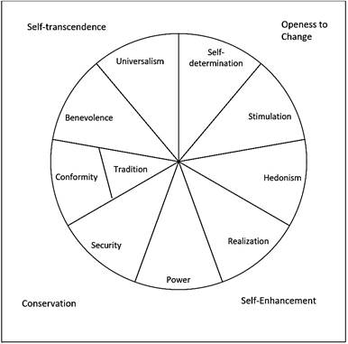 Figure 1 graphically demonstrates the circular structure proposed by Schwartz (1992), where the antagonism and the proximity between different values are highlighted.