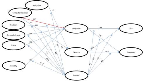 When evaluating the sense of obligation to give and its relation to moral or religious issues, aside from the motivations imposed by society on account of the occasion (Pépece, 2000), it is possible to perceive a contradiction in relation to the value of self-determination. As previously noted, for Schwartz (1992), self-determination aims at enabling independent thinking and free action in relation to choices, creation and exploration. It is reasonable, therefore, to propose that the search for autonomy given by self-determination would be contradictory to obligation, leading to the next hypothesis: "H7 - Self-determination has a negative effect on the obligation to give a gift."