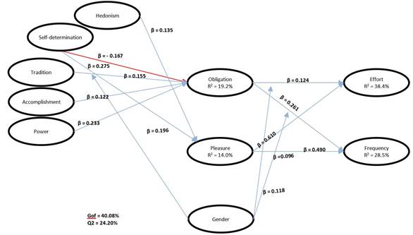 Regarding the frequency variable, it is worth mentioning that there was a significant (p-value = 0.000) and positive (β = 0.490) influence of pleasure on frequency. In females, there was a significant (p-value = 0.000) and positive (β = 0.261) influence of the obligation on frequency. In males, the impact of β = 0.261 reduces to -0.096, with a significant reduction (p-value = 0.003). Therefore, both impacts were positive, with the female gender being greater. It appears that the plea-sure, obligation and obligation x gender constructs were able to explain 28.5% of frequency.
