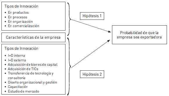 Otras investigaciones han demostrado que las innovaciones que realizan las empresas son uno de los factores determinantes para definir su orientación exportadora. Escandón-Barbosa y Hurtado-Ayala (2014), al analizar las pymes en Colombia, encontraron que las innovaciones realizadas explican un porcentaje elevado de los resultados de exportación de las pymes. De esa manera concluyen que, para poder acceder más exitosamente al mercado internacional, la innovación es un factor relevante.