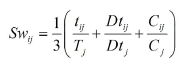 Una vez obtenida la ecoeficiencia de cada uno de los procesos, se calcula la ecoeficiencia de la CS a través de la expresión (10), Wi es el peso promedio del proceso i según componentes ambientales (expresión 11), n, cij y tij son términos ya explicados en las expresiones (3), (4) y (5), Iaij (T) es el impacto ambiental del proceso i al procesar el producto j en un periodo de tiempo T (suma de los impactos ambientales en cada una de las categorías) y tnij es el tiempo normado total para el proceso i en el producto j en unidades de tiempo por unidad de producto. El resultado de la ecoeficiencia fluctúa entre 0 y 1; aquí son deseables aquellos valores que más se aproximen al extremo superior.