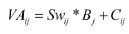 Para calcular el VA ij , se utilizó la metodología de Vinajera-Zamora, Marrero-Delgado y Ruiz-Morales (2017), reflejada en las expresiones (5) y (6). El término Swij expresa el peso específico promedio del proceso i en el producto j, es decir, el nivel de importancia de un proceso en el producto que se procesa. Constituye un valor promedio de la relación de tres parámetros esenciales, que son el costo agregado por el proceso i al producto j en unidades monetarias por unidad de producto (Cij), respecto al costo total de producto para toda la CS en las mismas unidades de medida (Cj); tiempo de elaboración del proceso i en el producto j en unidades de tiempo por unidad de producto (tij) respecto al tiempo del producto en la CS en iguales unidades de medida (Tj) y, por último, el tiempo de retraso promedio total del producto i en unidades de tiempo por unidad de producto (Dtij), respecto al tiempo total de retraso del producto en toda la CS en las mismas unidades (Dt). De esta forma, se considera el impacto del proceso más costoso, el que más demora y el que mayores atrasos provoca. El otro término empleado es Bj, que constituye el beneficio neto del producto j en unidades monetarias por unidad de producto.