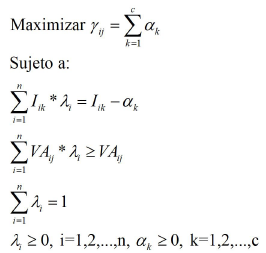 En este modelo (9), la variable que se debe optimizar es el valor de la ecoeficiencia del proceso i en el producto j (γij) expresada en eco-puntos o puntos ambientales; las variables de decisión son la reducción de la categoría de impacto ambiental K para llegar a la ecoeficiencia αk en iguales unidades de medida, utilizando el Eco-indicador 99 y el vector de pesos del proceso i (λi). Por su parte, Iik es un parámetro de entrada que expresa el impacto ambiental del proceso i en la categoría ambiental k, n la cantidad de procesos y c cantidad de categorías de impacto ambiental.
