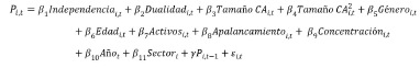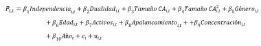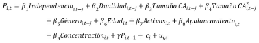 Donde P i,t es la variable dependiente asociada al desempeño de la firma i en el periodo t, que es medido a través de cuatro razones de rendimiento contable y de mercado: ROA, ROE, Q de Tobin y market-to-book10. Dentro del conjunto de regresores se encuentra el porcentaje de directores independientes respecto del total de integrantes del CA (Independencia); la dualidad de cargos (Dualidad) medida a través de una variable dummy que toma el valor 1 si el presidente del CA es también el CEO de la compañía y 0 en otro caso; el total de consejeros que componen el CA (Tamaño CA), junto con su valor al cuadrado (Tamaño CA2) con el objeto de capturar el grado de concavidad o convexidad de dicho efecto; y el porcentaje de mujeres que integran la junta directiva (Género).