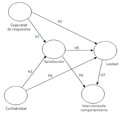 Con respecto a las siete hipótesis planteadas, en la tabla 7 se aprecia que solo una de ellas se rechazó. Los resultados evidencian que la capacidad de respuesta (H1, p=0,005*) y la confiabilidad (H3, p=0,000***) inciden significativamente en la satisfacción; la capacidad de respuesta (H2, p=0,001***) y la satisfacción (H5, p=0,000***) influyen positiva y significativamente en la lealtad; y la satisfacción y la lealtad favorecen las intenciones de comportamiento (H6, p=0,000***; H7, p=0,000***). La hipótesis 4 se rechaza, es decir, no existe evidencia de que la confiabilidad influya significativamente en la lealtad (H4, p=0,765ns).
