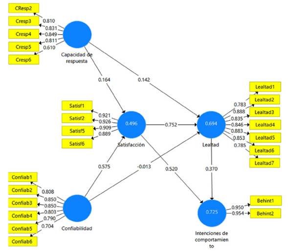 De los 28 ítems incluidos en el modelo de medición inicial, se eliminaron 4 por problemas de validez: 1 de capacidad de respuesta (CResp1, “los empleados de la aerolínea avisan a los clientes exactamente cuándo se ofrecerán los distintos servicios”), 2 de satisfacción (Satisf3, “está bien volar con esta aerolínea” y Satisf4, “tomé la decisión correcta al elegir esta aerolínea”) y 1 de intención de comportamiento (Behint3, “estoy dispuesto a seguir siendo un cliente de la aerolínea durante mucho tiempo”).