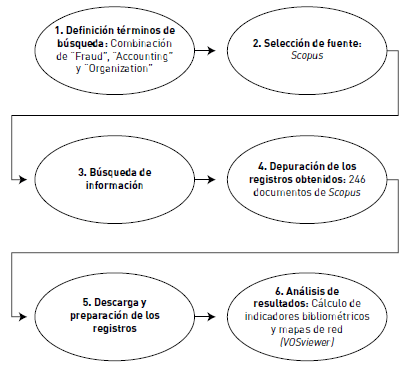 El análisis bibliométrico es un método cuantitativo de investigación basado en indicadores y en la visualización de redes que sirve para medir el desempeño o productividad, impacto o citación y la estructura o colaboración de distintos agentes, como instituciones, autores, revistas, países y referencias (Mazzoni, 2017; Milán-García, Uribe-Toril, Ruiz-Real y de Pablo-Valenciano, 2019). Este estudio bibliométrico se basa en un análisis bibliográfico sistemático de la literatura relacionada con el tema del fraude en la contabilidad de las organizaciones y sigue la secuencia de pasos que se muestra en la figura 1.