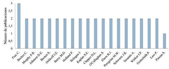 En la figura 2 se muestra la productividad de los 20 autores más activos en la producción científica sobre el fraude organizacional, de un total de 394 autores consultados. El análisis señala a Free C. como el investigador más productivo, con tres documentos. El segundo lugar de mayor productividad lo comparten 18 investigadores con dos documentos cada uno. Los resultados evidenciaron también que el 95,12% de los autores han escrito solo un artículo, lo que significa que, en esta temática, existen muchos autores ocasionales. Sin embargo, es de resaltar que, en esta lista de autores top, las parejas de investigadores Free C. y Murphy P. R. y Johnson C. B. y Schwartz W. C. publican en conjunto algunos artículos. Lo anterior indica que no hay una especialización en el campo analizado, por lo que, para corroborar la alta dispersión de las publicaciones generadas por los autores, se verificó el cumplimiento de la ley de Pareto, según la cual, se puede dar lugar a una concentración pequeña de autores (20%) que generen un gran volumen de conocimiento (80%). En este sentido, se obtuvo que el 79,16% de los autores son responsables de publicar el 80% de los artículos, por lo que no se cumple dicha ley, y se reitera que no existe concentración dentro de los autores y el conocimiento.