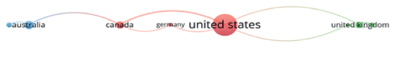 Por otra parte, se analizó la cooperación entre países con ayuda del programa VOSviewer, se seleccionaron los países y regiones que contribuyeron con al menos dos documentos. La figura 3 expone que el tamaño de la etiqueta y el círculo significan el número de publicaciones en cada país o región, y el grosor de las líneas entre dos nodos (círculo) simboliza la fuerza de la cooperación entre los países. De allí, se observa que existen tres grupos (clústeres), que están indicados en color azul rojo y verde, respectivamente. Los países dentro del mismo clúster participan en la colaboración de investigación entre sí en mayor medida que con países que se encuentran fuera del clúster; es decir, la mayoría de las contribuciones a la investigación sobre fraude han sido desarrolladas por Estados Unidos en colaboración con Canadá, Alemania y Reino Unido. Además, es posible desatacar un grupo de cooperación importante entre China y Austria que, aunque es menos fuerte, indica la relación entre dos continentes: Asia y Europa respectivamente.