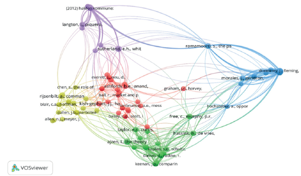En cuanto al color, círculos con el mismo color representan un mismo grupo con un tema de investigación similar, por tanto, en la figura 4 sobrede Sutherland (1940), con cuatro citas y 34 enlaces. El grupo de color azul trabaja sobre el tema de “el triángulo del fraude”, uno de los artículos de mayor impacto es el de Morales, Gendron y Guénin- Paracini (2014), “The Construction of the Risky Individual and Vigilant Organization: A Genealogy of the Fraud Triangle”, con tres citaciones y 22 enlaces. El grupo de color verde se refiere a estudios sobre la denuncia y los informes públicos de observaciones e irregularidades sobre el comportamiento y conductas poco éticas, entre las que se destaca el documento “The Theory of Planned Behavior”, de Ajzen (1991), con cuatro citas y 27 enlaces establecidos. El color rojo agrupa las investigaciones sobre los escándalos de corrupción en las organizaciones, en ese sentido el artículo “The Normalization of Corruption in Organizations”, de Ashforth y Anand (2003), es el más importante con tres citas y 24 enlaces. El último grupo, de color amarillo, investiga acerca de la relación ente los conceptos de narcisismo y fraude en la organización. El documento más citado corresponde a “Narcissus Enters the Courtroom: CEO Narcissism and Fraud”, de Rijsenbilt y Commandeur (2013), con tres citas y 17 enlaces.