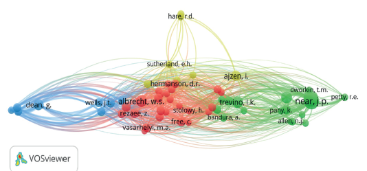 En la figura 5 se expone la red de cocitación de autores, en la que los nodos de mayor tamaño representan los autores que recibieron un mayor número de citas. El color de los nodos diferenció un agrupamiento para cada autor según su similitud temática. De allí, se identificaron cuatro grupos o clústeres para investigadores con la misma corriente de investigación o especialidad académica y científica. El grupo de color rojo agrupa 25 investigadores que publican sobre herramientas para detección y prevención del fraude, entre ellos sobresale Albrecht, W. S., con 30 citas y 497 enlaces.
