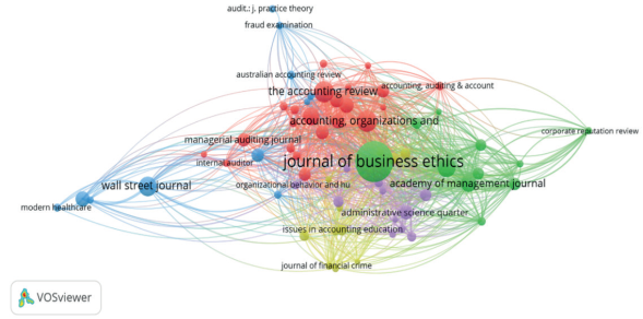 En la figura 6 se evidencia el mapa de cocitas de las fuentes de publicación que fueron citadas más de 10 veces por publicaciones acerca del fraude contable y organizacional. De igual manera, el tamaño del círculo indica el número de citas recibidas por las revistas de publicación, mientras que los círculos con el mismo color se agrupan en una misma temática. De allí, el número de enlaces corresponde al número de fuentes cocitadas con otras fuentes y el grosor de los enlaces representa el número de veces que dos fuentes han sido citadas juntas por otras publicaciones.