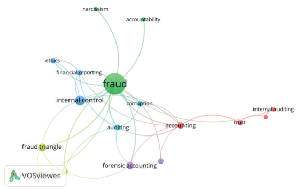 El término triangulo del fraude se observa como otra palaba clave con ocho repeticiones en la literatura y seis enlaces establecidos, en este sentido, Free (2015) explica la importancia del análisis del triángulo al basarse en gran medida en el comportamiento del individuo de forma aislada; sin embargo, resalta la necesidad del análisis de la persona y sus acciones fraudulentas frente al contexto social. Otras palabras clave que parecen estar fuertemente conectadas con las palabras clave mencionadas representan los diferentes marcos teóricos que normalmente se usan en la literatura sobre el campo de investigación, como contabilidad, corrupción, auditoría, reporte financiero, entre otras.