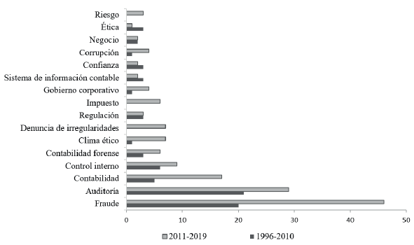 La publicación científica sobre fraude contable ha presentado cambios significativos en las palabras utilizadas al comparar los periodos 1996-2010 y 2011-2019. Se puede identificar que palabras como ética y sistemas de información contable han dejado de ser utilizadas y han sido reemplazadas por otras como ambiente ético, fraude, auditoría, contabilidad, control interno, contabilidad forense, impuestos y denunciante, que durante el final de la década del noventa y la primera década del siglo XXI no se utilizaban. En la figura 8 se pueden observar las palabras clave más utilizadas y las tendencias actuales.