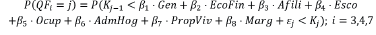 Con este modelo se buscó establecer una función lineal para cada uno de los índices de alfabetismo financiero planteados, a partir de las variables independientes y un conjunto de intercepciones, de tal manera que la probabilidad de obtener cierto número de respuestas correctas corresponda a la probabilidad con que la función lineal estimada más el error por aleatoriedad se encuentren entre un par de intercepciones consecutivas estimadas para ese valor. Esto se observa en la ecuación 5.