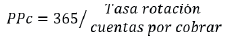 De esta forma, para Orellana, Reyes y Cevallos (2019) , el riesgo crediticio es la “incertidumbre de efectuar los cobros en los períodos de tiempos establecidos provenientes por los créditos otorgados a los clientes, el cual tiene una relación directa con la liquidez de la empresa” (p. 12). Para esta investigación y con base en Gakure, Ngugi, Ndwiga y Waithaka (2012) , se tomó el período promedio de cobro (PPc) como una relación que indica el número de días que se demora una empresa para que las cuentas comerciales por cobrar se conviertan en efectivo. Mientras menor sea el número de días, más rápido se cobran las cuentas que adeudan los clientes, conforme la siguiente expresión: