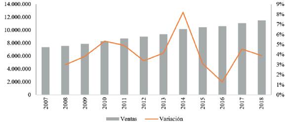 Figura 1 Ventas (miles de millones de dólares americanos) y crecimiento porcentual del sector de alimentos a nivel nacional 2007 - 2018