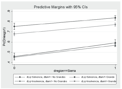 Por otro lado, se analizan las variaciones de los efectos marginales de las variables que integran el modelo, evaluando una alta significancia. En este caso, se aprecia que si las empresas están ubicadas en la región Sierra, la probabilidad de tener un alto riesgo de crédito se incrementa en 11 puntos porcentuales. Así mismo, si la empresa tiene un mayor tamaño (grande o mediana), la probabilidad de tener un alto riesgo de crédito se incrementa en 43,2 y 33,8 puntos, respectivamente (figura 4).