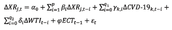 In equation (1), α0 is the constant term and XR j stands for the direct quote of the currency exchange rate to the U.S. dollar for country j. CVD-19 k represents each of the four variables related to the novel coronavirus in the corresponding specifications. Such variables are the total new cases reported (TNC), the number of new cases outside China (i.e., the number of the rest of the world new cases, RWNC), the total fatality rate (TFR), and the rest of the world fatality rate (RWFR). WTI is the market price of the West Texas Intermediate crude oil. The short-run coefficients β, γ k, and δ correspond to the exchange rate examined -considering the COVID-19 variable, and the WTI oil price, respectively. The long-run coefficients for these variables are denoted by θ 1, θ 2, and θ 3, correspondingly.