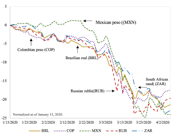 In the first quarter of 2020, the Brazilian real (BRL), Colombian peso (COP), Mexican peso (MXN), Russian ruble (RUB), and South African rand (ZAR) exchange rates to the U.S. dollar sharply depreciated (Grenier, 2020; Lei &Villamil, 2020; Mathew, 2020). Figure 1 depicts the depreciation of such currencies between January 13 and April 6, 2020. Brazil, Mexico, and Russia are oil-exporting countries, while Colombia and South Africa are considered oil-importing economies.