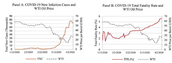 As evidenced by panel A of Figure 2, from mid-January to early April 2020, the total new cases of COVID-19 and the price of the WTI oil exhibited opposite patterns. International health authorities reported the first COVID-19 case outside China on January 13. From that date on, the number of new infections rapidly increased across the world, and at the same time, WTI prices declined. However, oil prices plunged on March 9, when Saudi Arabia announced a sizable increase in its oil production after failing to reach an agreement with Russia intended to stabilize the prices of that commodity (Halff, 2020). Throughout the first week of March, the number of new infection cases of the novel coronavirus climbed, and, as shown in Panel B of Figure 2, the total fatality rate displayed an upward inflection point also around the same week.