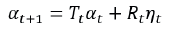 donde T t es una matriz de transición de dimensión d × d, R t es una matriz de control de dimensión d × q, ƞ t es el vector de error q-dimensional con una matriz de difusión de estado Qt de dimensión q × q, tal que ƞ t~N(0,Qt). La ecuación de estado gobierna el cambio dinámico del vector de estado αt a través del tiempo.