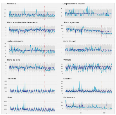 Ahora, con respecto al análisis del efecto causal de las medidas tomadas contra la COVID-19 sobre el crimen, uno de los trabajos más tempranos y robustos identificados es el de Campedelli et al. (2020). Aplicando un modelo de serie de tiempo estructural bayesiano (BSTS), los autores encontraron que, en promedio, delitos como el hurto en general, el hurto a establecimientos comerciales y el asalto por contacto y agresión disminuyeron. Por otro lado, los autores no encontraron un efecto significativo para hurto de vehículos, asalto con lesiones graves, violencia de pareja o violencia de género y homicidio.